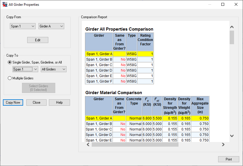 Select Copy > All Girder Properties... This will bring up the Copy Girder Properties window. Select Span 1 Girder A in the "From" list. This is the girder you will be copying from. Select Span 1 All Girders in the "To" list. The properties from Girder A will be copied to these girders. Note that the Comparison Report enables you to quickly compare differences between the selected From girder and other girders in the bridge. Press [Copy Now] to copy the properties.