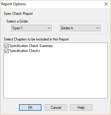 The Girder Designer considers only a subset of the criteria that typically controls a design. You should always consider the design as a starting point rather than a final solution. The next step is to perform a full specification check on the girder. To do this, you will create a Specification Check Report.