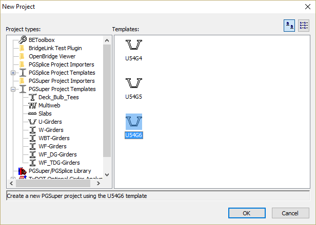 New PGSuper projects are created from project templates. The templates contain standard configurations for bridge geometry and components, appurtenances, loading, and design criteria. Since this is a WSDOT U54G6 girder bridge, the easiest way to start is with the U54G6 template.