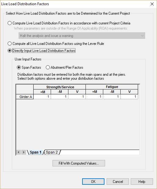 This particular bridge configuration violates the minimum number of girders required for simplified analysis (See AASHTO LRFD 4.6.2.2). However, since we have a single girder line and only one design lane it is obvious that the distribution factors should be 1.0. We will need to explicitly input the distribution factors.