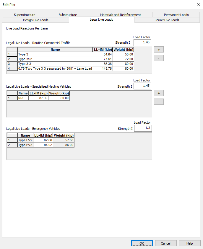Once again, because our pier is defined independently from the bridge, we have to supply the live load reactions from the superstructure. Live load reactions and load factors are defined on the Design, Legal, and Permit Live Loads pages.